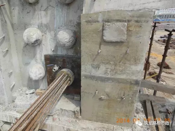 錨墊板下混凝土應(yīng)力為集中,在張拉過程中多因混凝土強(qiáng)度不足而崩裂凹陷。